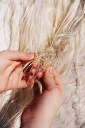 Der nächste Schritt ist die Demineralisierung der Haarknoten mit der Cowboy Magic ® Rosenwasser Spülung. Massiere die Spülung in die Knoten ein, um die mineralischen Ablagerungen aufzulösen und um das Haar zu befeuchten. Für beste Ergebnisse lässt Du die Spülung für ein oder zwei Minuten einwirken, danach kannst Du die Haare gründlich ausspülen.
