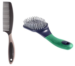 Einen Kamm benötigt man für die Pflege der Mähne. Kurze Mähnen sind am besten mit einem Kamm zu pflegen und um Verwirrungen aus der Mähne entfernen zu können. Für lange Mähnen und auch den Schweif empfiehlt sich eine Mähnenbürste mit mittellangen Borsten.